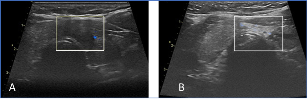 Das Schilddrüsenkarzinom (A) im weißen Rechteckt ist nach der Therapie nicht mehr nachweisbar (B). In Deutschland hat Prof. Korkusuz die meisten Ablationen von Schilddrüsenkarzinomen erfolgreich durchgeführt.