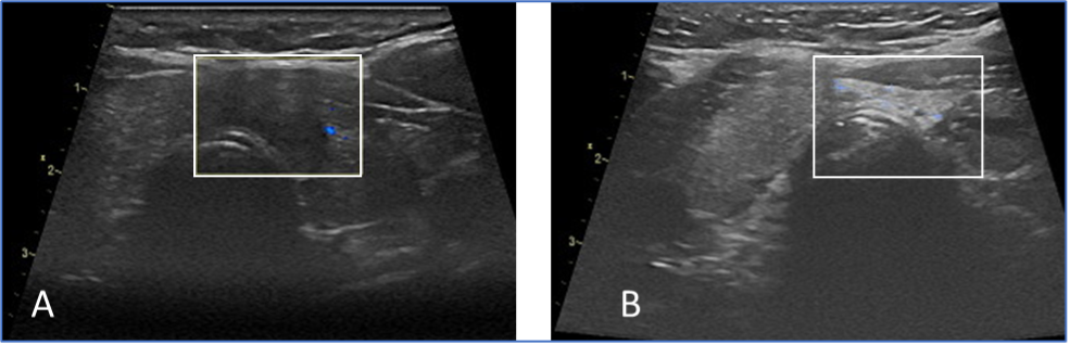 До (А) и после (B) лечения кисты щитовидной железы. После терапии киста больше не заполняется.