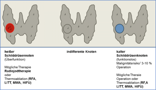 Kalt“ bedeutet, dass der Knoten die Funktion Jod aufzunehmen verloren hat. Wenn Gewebe diese Funktion verliert, kann es sich potenziell um ein „bösartiges“ Gewebe handeln. Die Wahrscheinlichkeit dafür ist jedoch sehr sehr gering, ca. 1  bis 3 %. Diese Knoten sollten gemäß der Leitlinie der Deutschen Gesellschaft für Nuklearmedizin durch eine Feinnadelpunktion abgeklärt werden. Wenn die Feinnadelpunktion unauffällig ist, dann ist eine weitere Behandlung nicht zwingend notwendig. Falls der Knoten stört, dann könnte eine Thermoablation durchgeführt werden (siehe Abbildung).